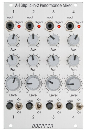 A number of input modules can be cascaded to form a mixer with more inputs, growing with your needs. Modules A-138p and A-138o are used to built a simple performance mixer (instead of an external stand-alone mixer). The module A-138p is the 4-fold input module while A-138o is the output module that can be combined with one or more A-138p's, resulting in a mixer with four, eight, twelve or even more inputs. The A-138p Performance Mixer Input features four identical input channels. On top is the input socket with a peak LED, the input gain control for adapting to different signal levels is located at the bottom for practical reasons, just besides the mute switch. Beneath the input there's a potentiometer setting the aux send level. Per channel you can determine whether the aux control is pre or post. The next potentiometer sets the panorama position for the according channel and below we can find a bigger potentiometer responsible for the channel's output level which is then sent to the output module.