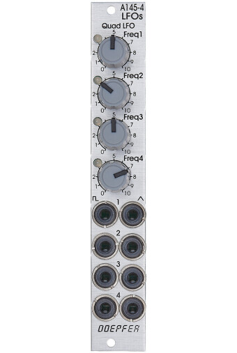 Module A-145-4 is a simple quad LFO (Low Frequency Oscillator). Not a very "exciting" module, just a bread-and-butter device and a simple demon for work. Virtually in every modular system several LFOs are required for modulation purposes. The module contains four simple LFOs with the waveforms triangle and rectangle. A dual color LED (red = positive / yellow = negative output voltage) indicates the triangle output of each LFO. The frequency range can be chosen for each LFO individually by means of a jumper between about 50 Hz ... 0,04 Hz (about 20 seconds, jumper removed) and about 2Hz ... 0,002 (about 8 minutes, jumper installed).