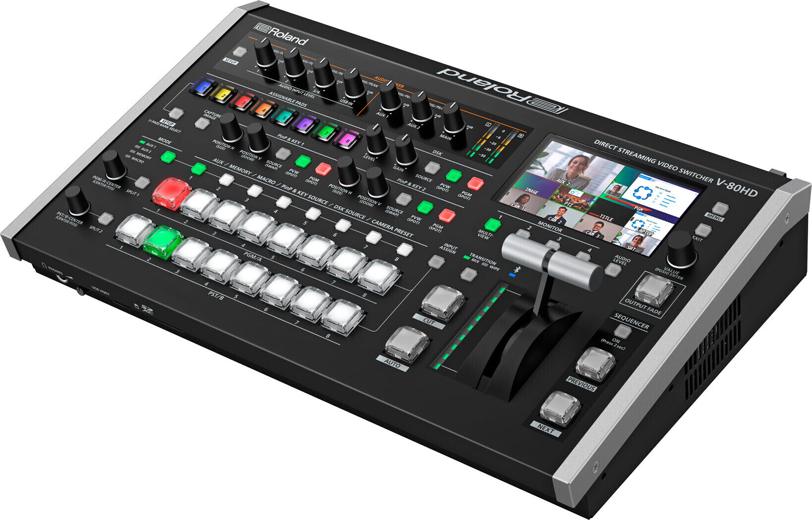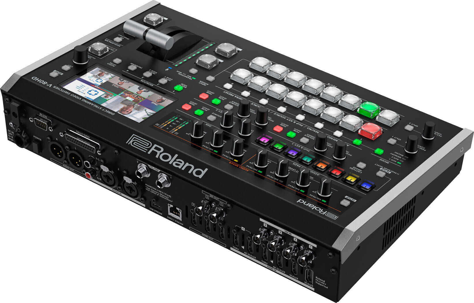 Roland V-80HD — восьмиканальный видеомикшер с прямым стримингом и записью, поддержкой HDMI/SDI, встроенными видео- и аудиоэффектами, медиаплеером и управлением удалёнными камерами.