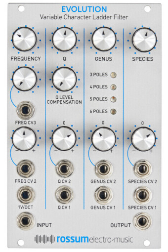 Evolution is not limited to one filter slope. Having a number of filter poles it offers four slopes: -18, -24, -30 and -36dB per octave. The GENUS parameter makes it possible to blend smoothly and continously between the slopes, even with CVs, een in audio rate! This feature is unique with Moog cascades!