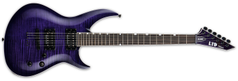 Guitars in the LTD 1000 Series are designed to offer the tone, feel, looks, and quality that working professional musicians need in an instrument. The LTD H3-1000 has the bold angular curves of the ESP Horizon-3, with an extended and beveled upper horn and a shortened lower horn, while being made available at a price most musicians can still afford. The H3-1000 offers set-thru construction at 25.5” scale for smooth access to the highest frets, pairing a mahogany body with flamed-maple top to a three-piece maple neck with Macassar ebony fingerboard. It includes a Tonepros TOM bridge with string-thru-body design, and a Seymour Duncan Custom-5/Jazz pickup set, with a push-pull coil split on the tone control. Available in See Thru Purple finish.