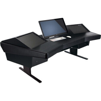 The black Dual 15 Workstation Desk with Two DR800 Front 8 RU from Argosy is designed with an 8 RU angled top to avoid reflections from speakers. It supports a full-size keyboard controller at your fingertips. The chassis design defeats thermal buildup and permits easy cable access. Its steel legs support 19 to 32mm powder-coated MDF components to support your studio equipment. An enclosed utility area separates, conceals, and protects vital gear and cabling.