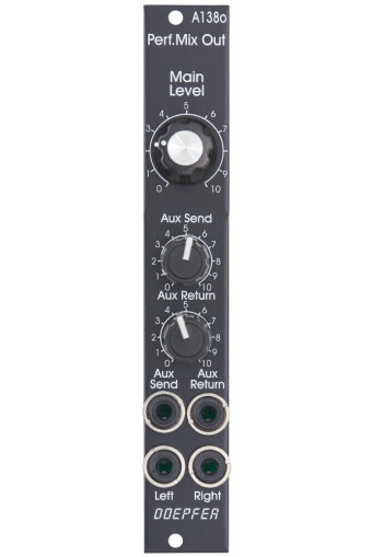 No matter how many A-138p Input modules are connected, the A-138o Performance Mixer Output adds all of them to one stereo sum which is emitted at separate sockets for left and right. Besides this all signals from the channel auxiliaries are summed, available at the Aux Send socket. The Aux Send level can be adjusted. the effect signal has to return into the mixer somewhere of course, which is handled via the Aux Return mono socket. The Aux Return level is adjustable with a potentiometer.